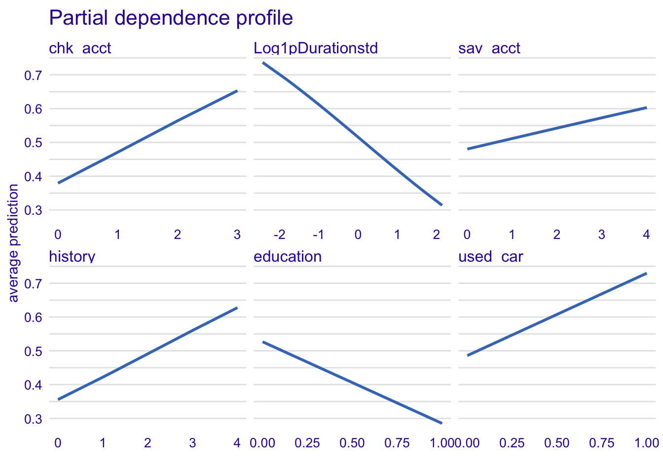 plot(model_profile_glm1, variables = c("chk_acct", "Log1pDurationstd", "sav_acct", "history", "education", "used_car")) + ggtitle("Partial dependence profile ", "")