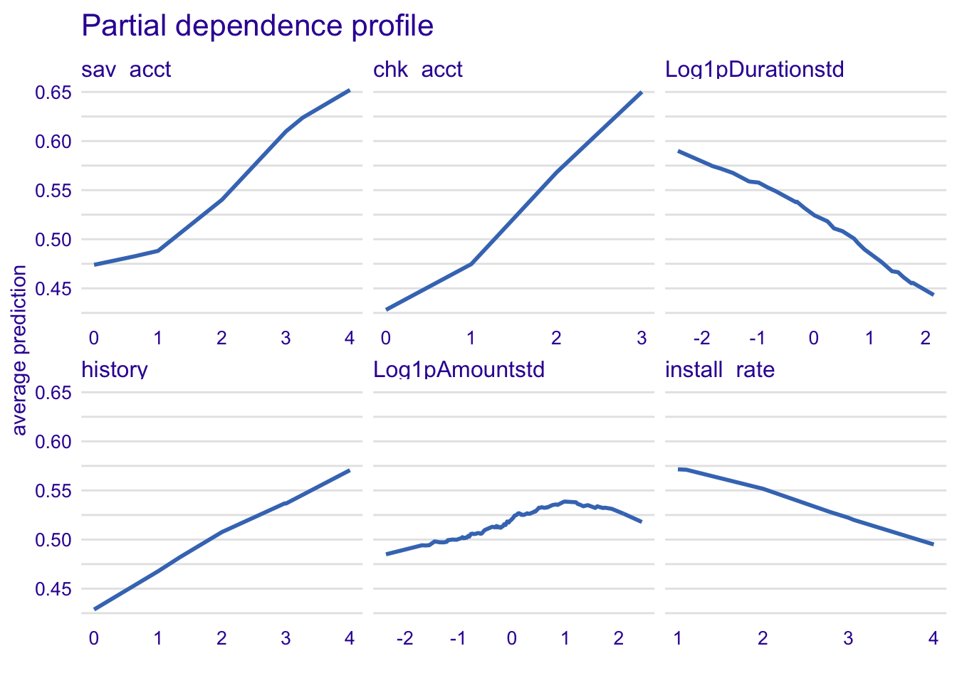 plot(model_profile_knn1, variables = c("sav_acct", "chk_acct", "Log1pDurationstd", "history", "Log1pAmountstd", "install_rate")) + ggtitle("Partial dependence profile ", "")