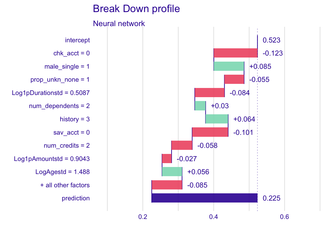The intercept value corresponds to the mean value of predictions for the complete dataset. The following values show the changes in the mean prediction when values of variables are fixed. The prediction line in purple corresponds to the value of the prediction of the specific instance, it is the sum of the overall mean value and the variations. The green bars and the red ones show respectively the positive and the negative changes in the mean prediction.