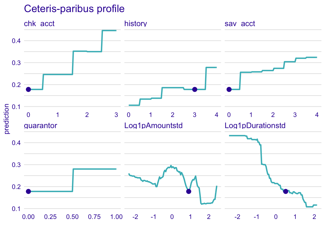 model_profile_knn1 <- model_profile(explainer_knn, type = "partial", variables = c("sav_acct", "chk_acct", "Log1pDurationstd", "history", "Log1pAmountstd", "LogAgestd"))