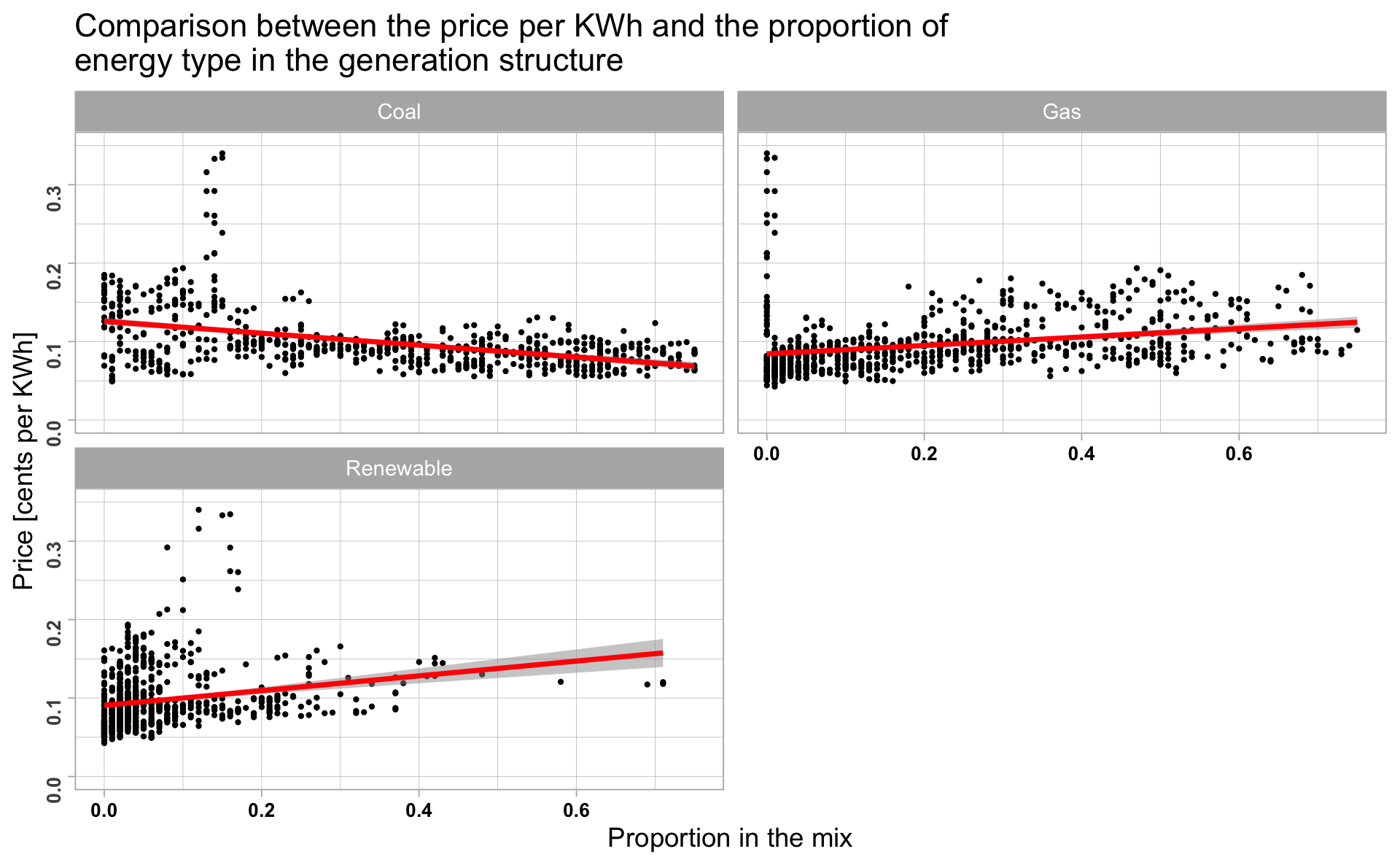 However, we can see from our graphs that coal power generation is a key driver to lower the price. We can also see that the mixes between states and regions are very different and it is therefore difficult to define a ratio that exactly predicts the price per KWh.