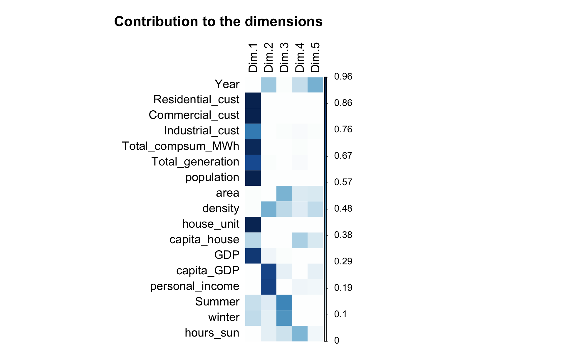 We will focus on the first dimension because the variable that we want to predict (Total_compsum_MWh) is in dimension one. We will also keep other variables that represent the most the principal dimension (Dim 1) because they are correlated to the variable “Total_compsum_MWh”.