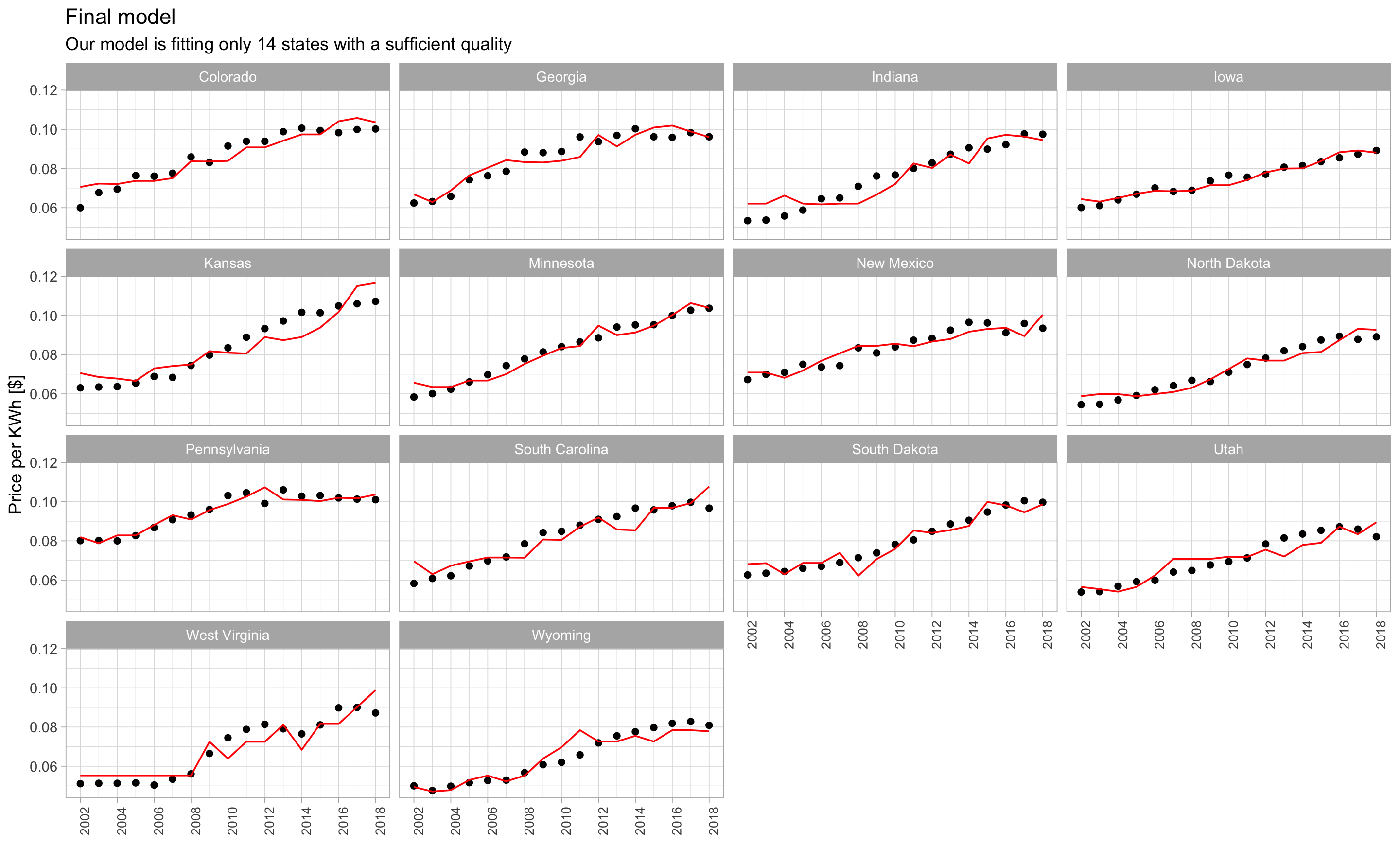 For these 14 states, the annual price of electricity is correctly predicted. The model reflects the upward trend of the price.